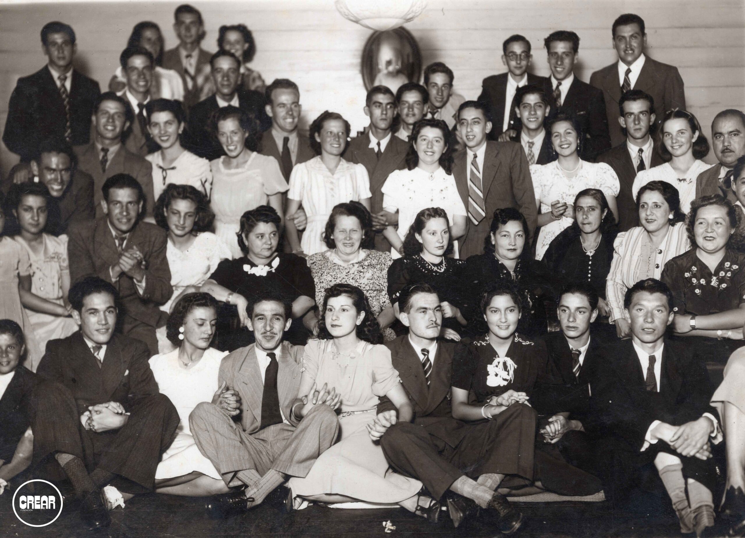 - Descripción : Fotografía de un grupo en blanco y negro de 22 mujeres, 21 hombres y un niño, todos en tenido formal