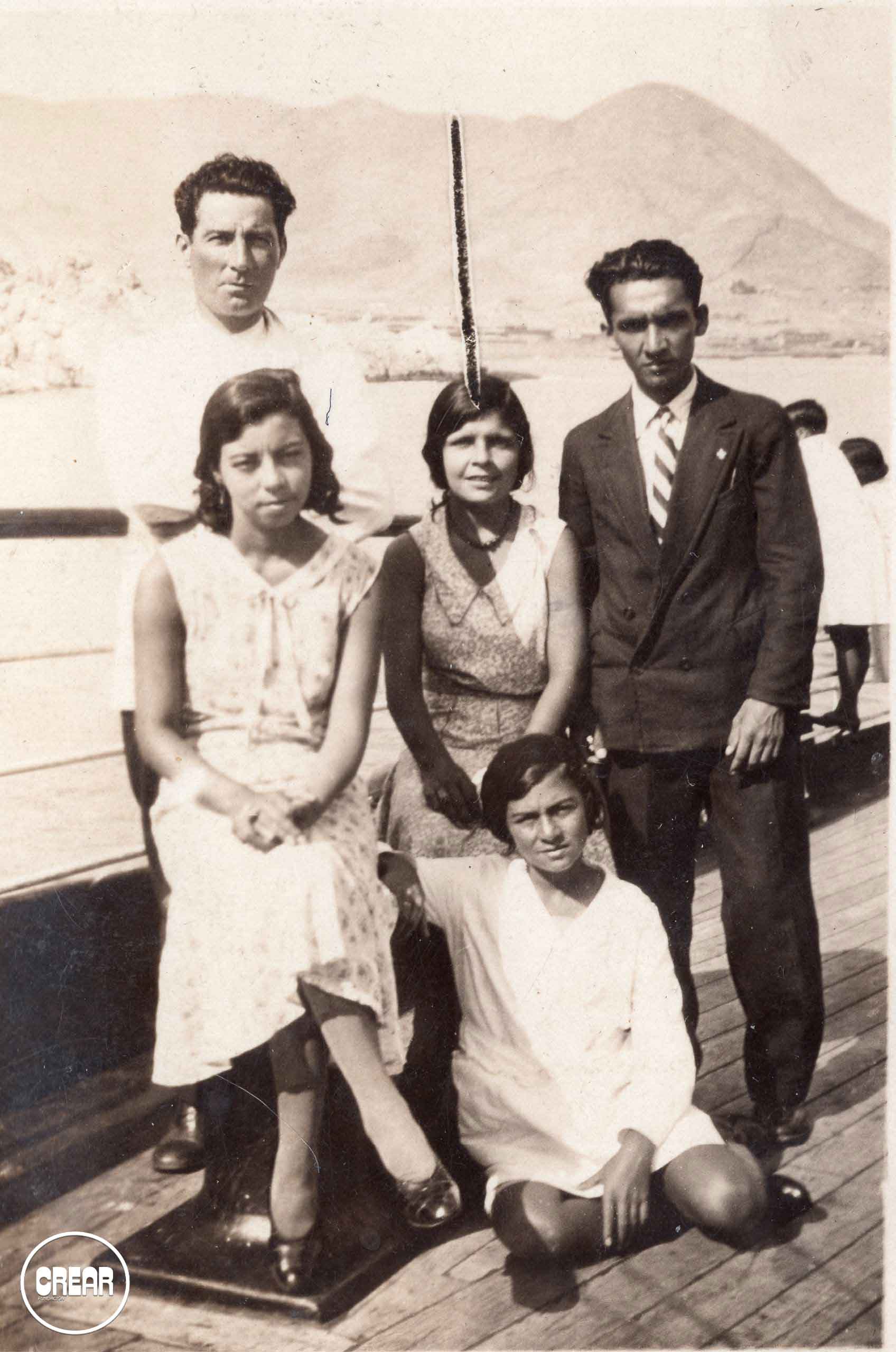 - Descripción : Plano entero en blanco y negro de tres mujeres y dos hombres, todos en tenido formal, al fondo parece el mar y los cerros
