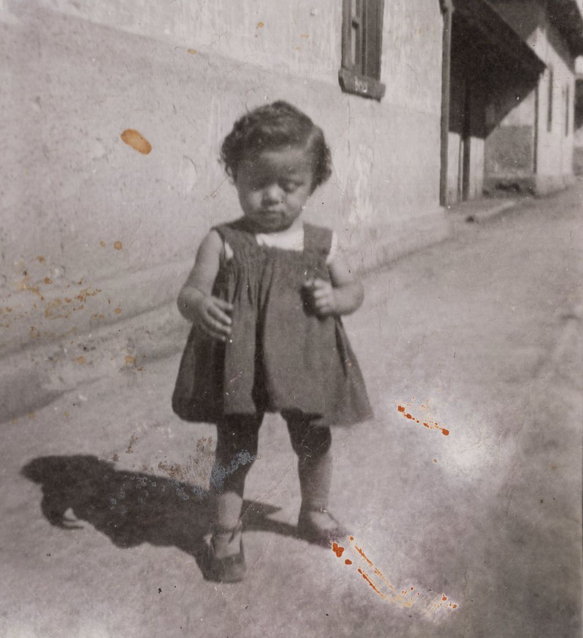• Descripción : Plano bajo en blanco y negro de una niña pequeña en la calle